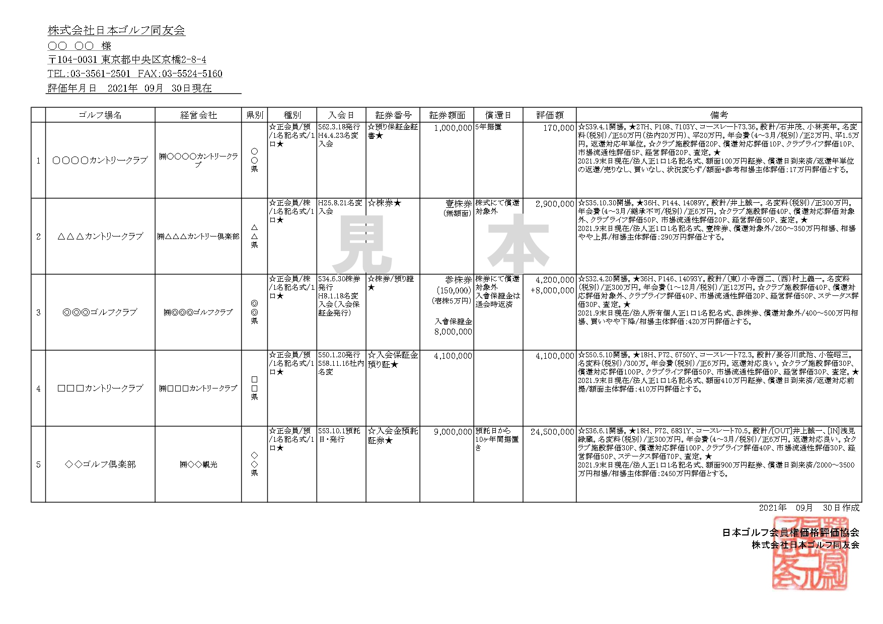 日本ゴルフ同友会では各ゴルフ場のゴルフ会員権相場・預託金返還状況などを鑑みて、適正な時価を算定させていただきます。
